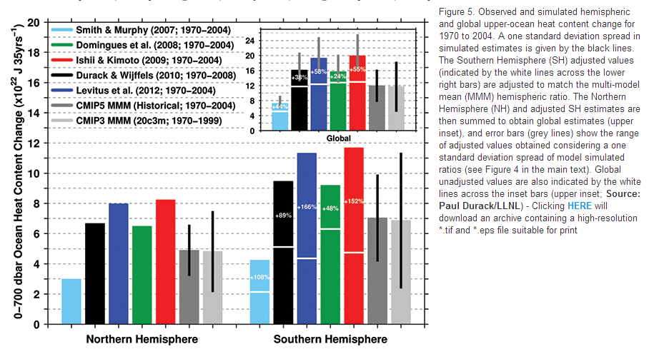 Argo data beginning 2005 for 0-700 and 0-2000 meters both show the global oceans warming at rates of only 0.03 deg C/decade.
