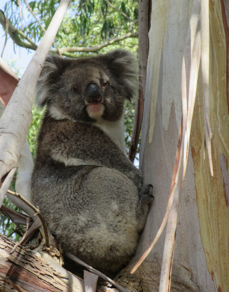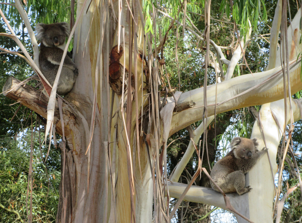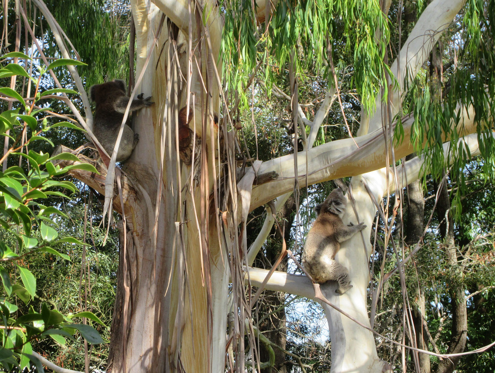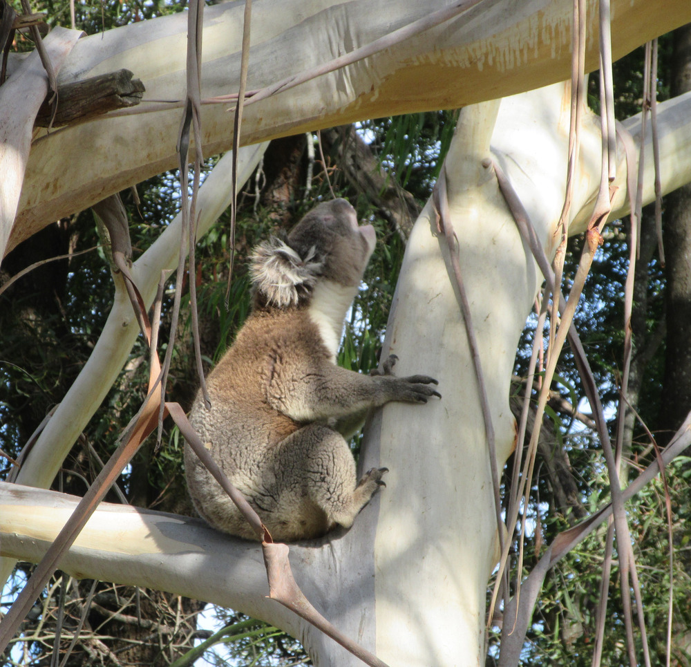 So Mr Grunty, the local male koala, who kept waking us during the night was still in the peppermint gum by the gate this morning. And his work paid off. KoalaLady arrived a little while ago and the noise intensity increased. The ladies scream during mating. Anyway, I went out with the camera and it was all over. It is a very quick activity for them. And they were sitting in the tree in different forks.