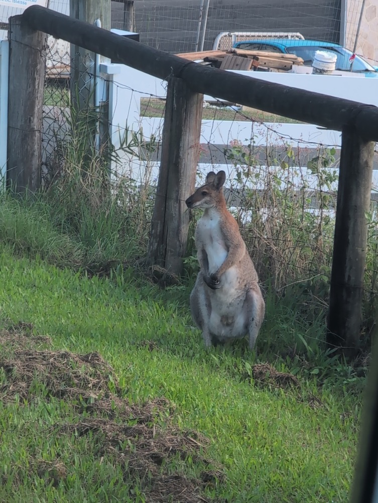 Just walking back to the caravan then, and spotted a wallaby next to the fence. I had to walk closer to it to get back into the caravan but it just stood there. Normally they bounce away.