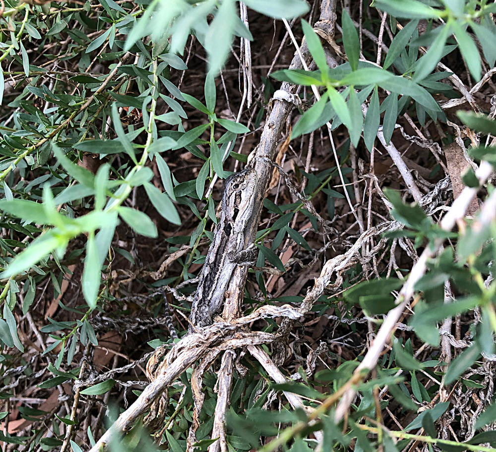 Hiding inside a large Eremophila bush is, a tiny bearded dragon. My garden is a haven for them. They breed here and the young are more safe here.