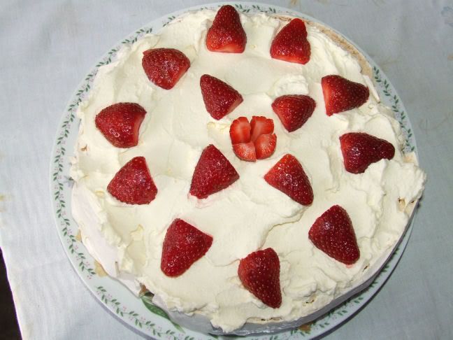 well my cake turned out pretty good for a first effort. I have learnt to add the flour to the beaten eggs gradually or you will have a big bubble of dry flour in your mix which breaks up into ever smaller bubbles so it takes more working than it should. Also when adding the melted butter make sure it is ALL mixed in before pouring in the tin or you will end out having to mix it while IN the tin, again working it more than it should. So the cake was a bit heavier than I would have liked, but good for a first try. I have decided that I should have added more strawberries in the centre and although the icing was made with real strawberries it still tasted just like pure sugar. If I added more strawberries then it made it too runny, hence the dribbles down the side. I had to take the picture quickly as the strawberries kept sliding off too! think I’ll just stick to whipped cream ;)