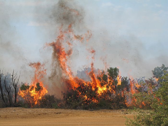 There was considerable acreage burnt and I understand a couple of homes, the power was off for 6 days and the mainline telephone is still down. The flames flared several hundred feet into the air, well above the 2 metres stated above. The reason the flames reached such heights is due to the high dune system around Stockyard Creek, which runs from west to east (the main direction of the 100 km/hr winds).
