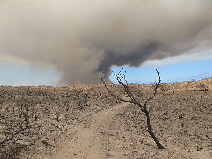 This is the aftermath of the fire taken on the 20th, where its intensity can be judged at how everything had been burnt. The column of smoke was from the remains of the fire near the coast at the southern end of Stockyard Road.