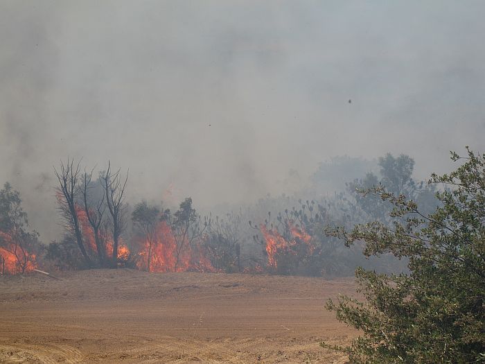 There was considerable acreage burnt and I understand a couple of homes, the power was off for 6 days and the mainline telephone is still down. The flames flared several hundred feet into the air, well above the 2 metres stated above. The reason the flames reached such heights is due to the high dune system around Stockyard Creek, which runs from west to east (the main direction of the 100 km/hr winds).