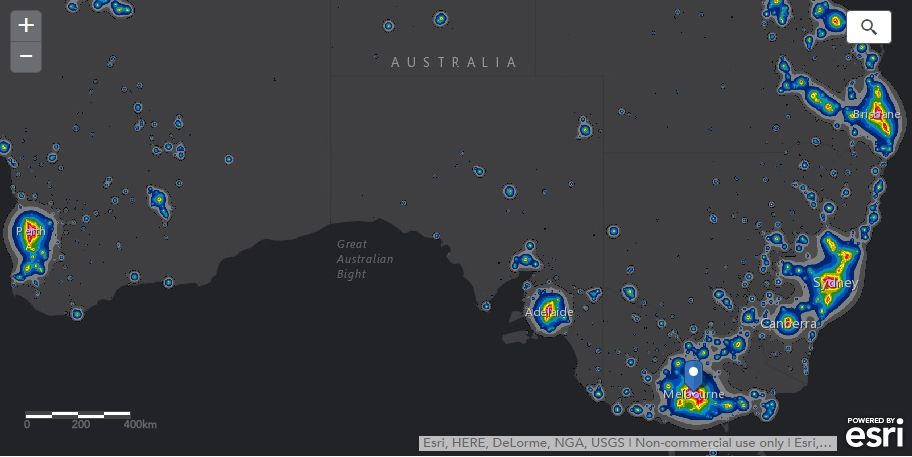 The USA and Australia screen dumps are the same scale. Comparing the maps I see that light pollution from Sydney (incl. Newcastle and Wollongong) is very similar to that from Salt Lake City. The Salt Lake City “combined statistical area” has a population of 2.4 million, less than half the Australian equivalent.