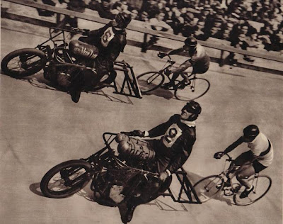 British rider Harry Grant (No. 5) passes Georges Wambst (No. 2 – France) for a second time during the 1935 “Les Cent Miles” at theParc des Princes in Paris. This event had the riders racing behind motors for 160 kms, “cent miles”.