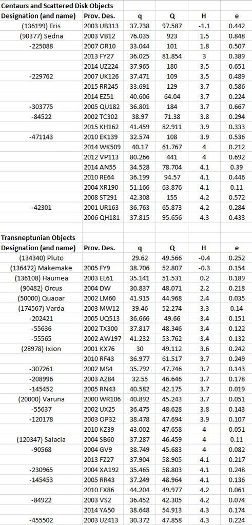 Top dwarf planet candidates, excluding Ceres and Charon. The biggest have the highest brightness (lowest H magnitude). q and Q are the closest and furthest approaches in Astronomical Units (Earth is 1). e is the eccentricity (0 is circle and 1 is parabola).