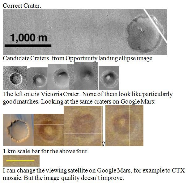 Giving up on trying to find this crater. It’s about the same size as Victoria crater, but that’s not it. It’s about the same size and shape as a crater just north of the centre of the landing ellipse, but the orientation is wrong. There’s another crater about the same size in the landing ellipse at the far opposite end to the Opportunity Rover, but the satellite imagery isn’t good enough for a direct comparison.mollwollfumble said: