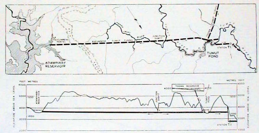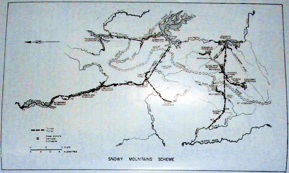 … except for the tunnels that were greatly lengthened and bored lower down in the rock than in the 1948 plan. I know enough about the Snowy to know that the original plans had tunnels joining the reservoirs in pairs. The final version has horizontal tunnels on two levels only, which allowed free transfer of water with minimal energy loss between the reservoirs on each level. This arrangement also greatly increased the power generating capacity of the scheme.