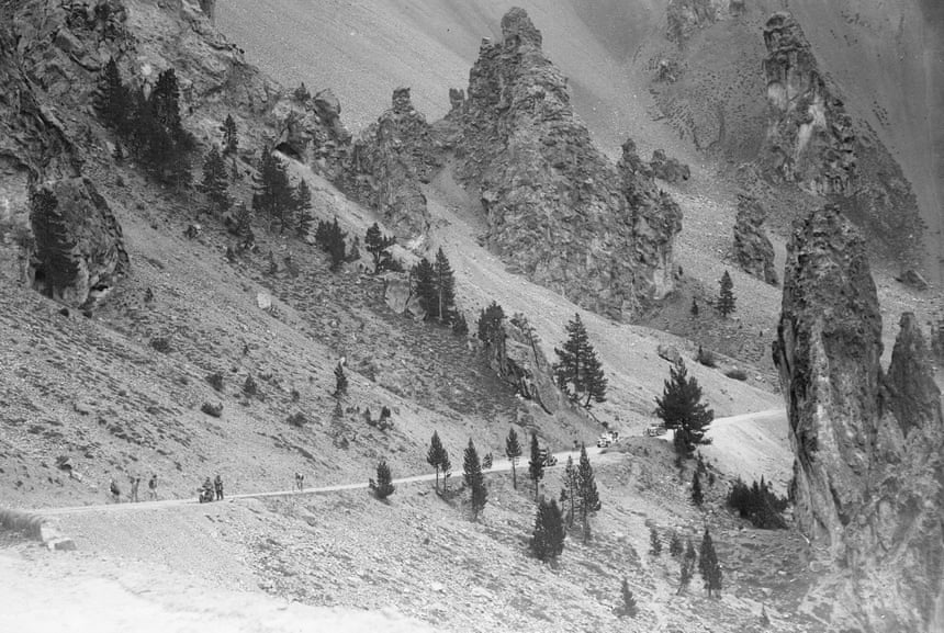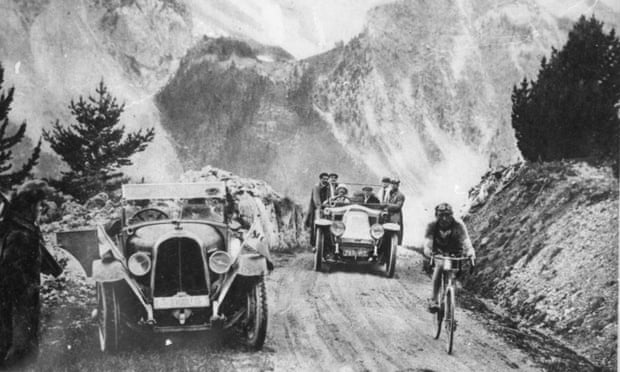 Tonight’s stage goes up the spectacular Col d’Izoard. Here’s Ottavio Bottecchia climbing the Izoard on the 1925 Tour.