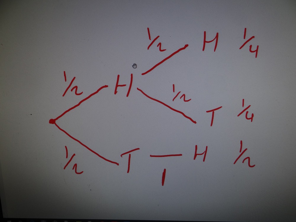 Now suppose that I know that one of tosses resulted in heads. What’s the probability that the other was a head? I make it 1/3 (because the “tail, tail” line of the above table is no longer a possible outcome, so there are three possibilities.) The probability of a head and a tail is then 2/3.