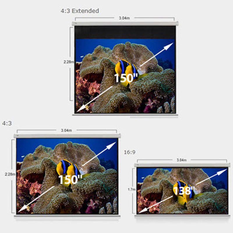 Diagonal at 150 inches, (at 4:3 screen ratio), gives a width of 3.04 metres. (bottom left pic). (note 16:9 ratio at the same width of 3.04 metres, gives 138 inches diagonal, bottom right pic).