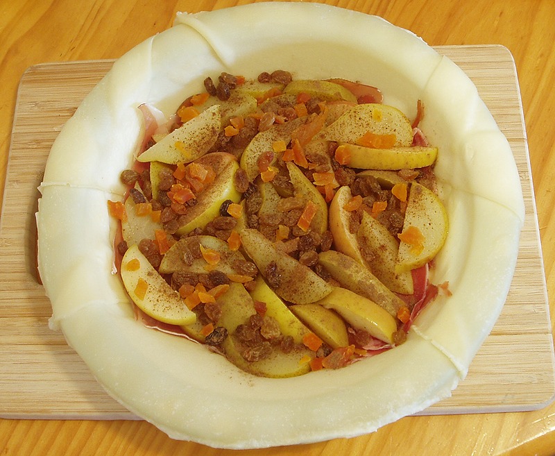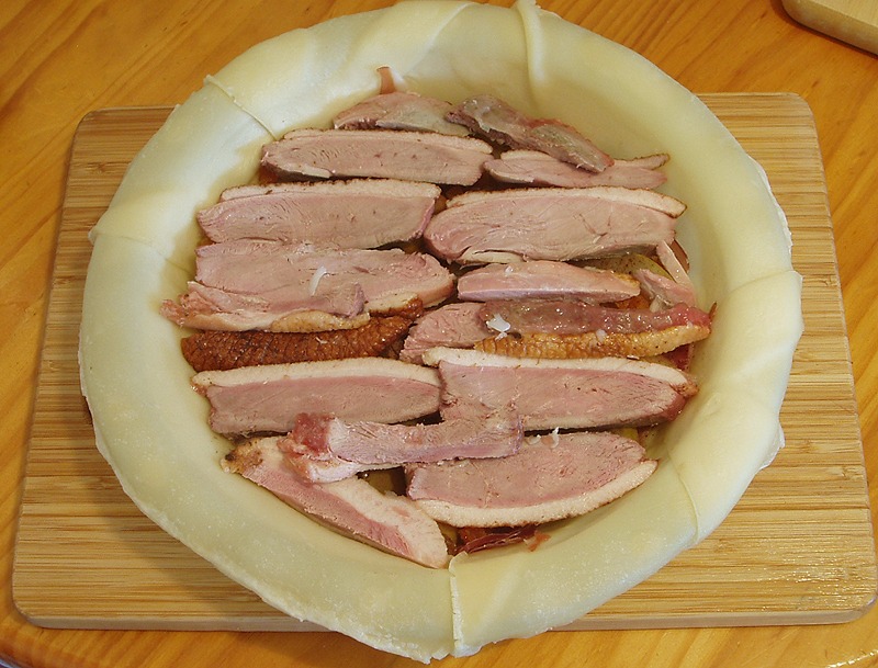 My duck breasts are ready-cooked so I just have to slice them and arrange in a pie with lightly cooked sliced apple & pear, sultanas etc. After laying a bed of prosciutto on the pastry base.