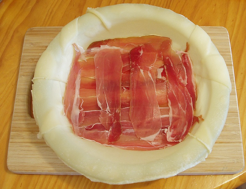 Layer of prosciutto in place. To be followed by a layer of fruit, layer of duck, etc until a plump pie is formed.