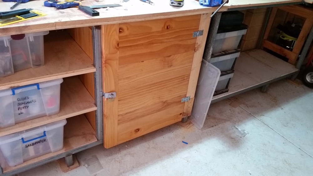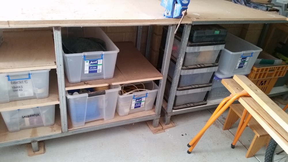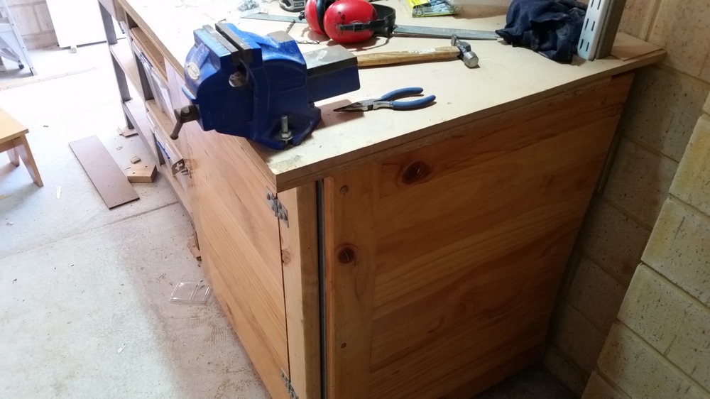 That will be easy. I have some old pieces of table top that should fit nicely. Solid timber. Won’t be Fort Know by any stretch but will not be taken apart without some effort if all the fixings are on the inside. The bay under the vice. The bench on the right will slide out to give access. The bench on the left is bolted to the wall.