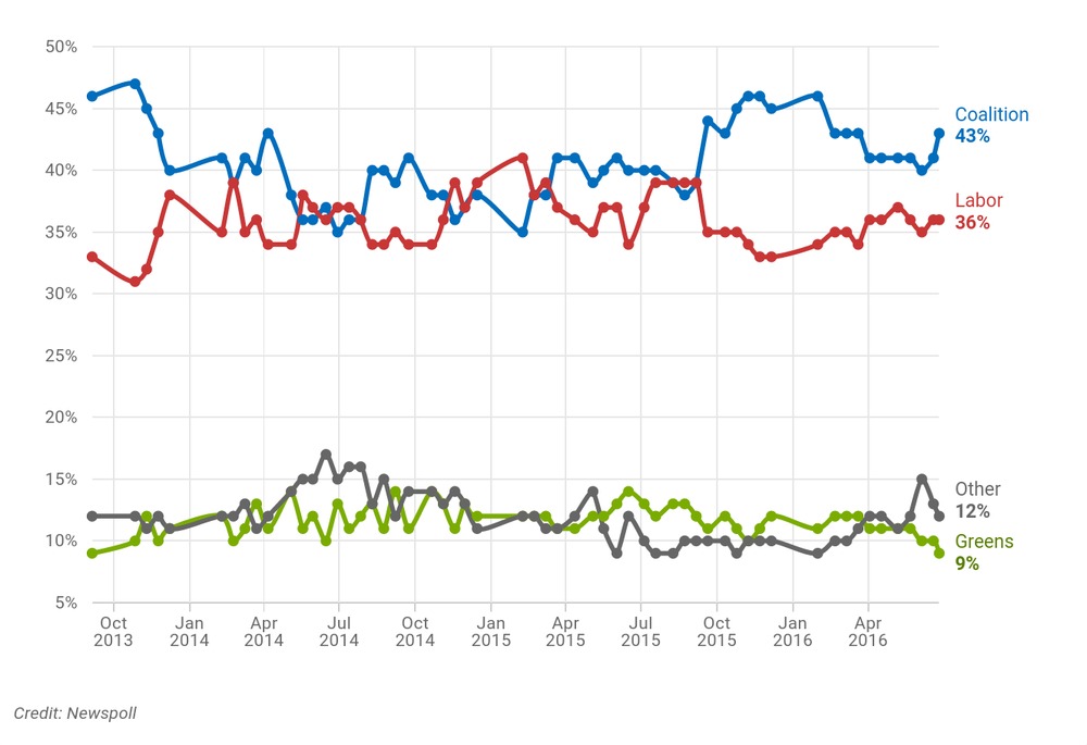 The latest survey published by the Australian on Sunday night has Labor ahead of the Coalition on the two-party preferred measure 52% to 48%.
