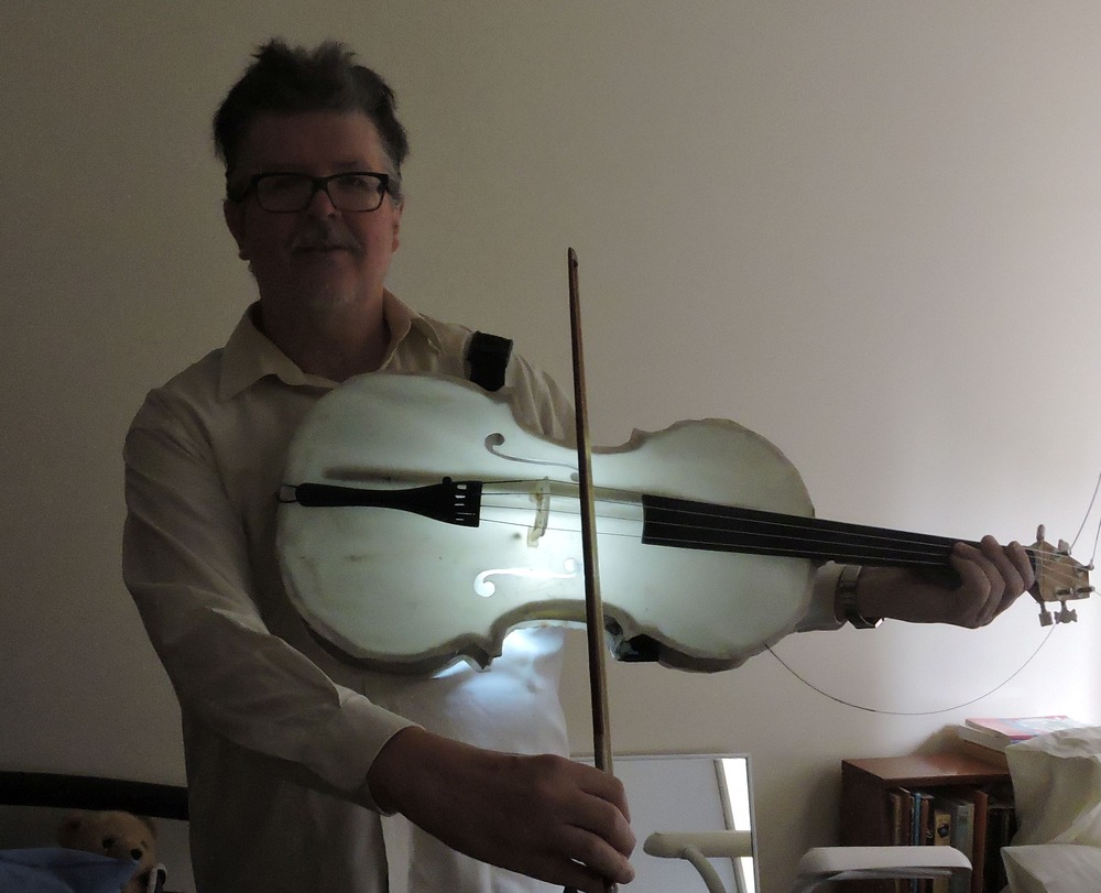 It’s not a viola but I don’t have a name for it because, so far as I can tell, nothing quite like it has ever been made before. It’s in the violin family, is half way in size between a violin and a cello, is made mostly of polyester and, despite being bowed, will be held off straps like a guitar. It’s not tuned like a viola or cello, but in between.