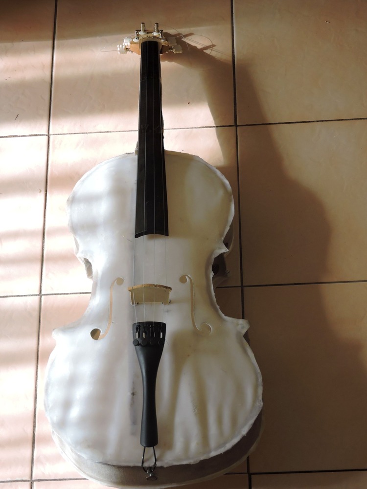 Yesterday afternoon, mollwollfumble’s polyester “tenor viola da spalla” with guitar headstock and steel thrust rod was finally completed.