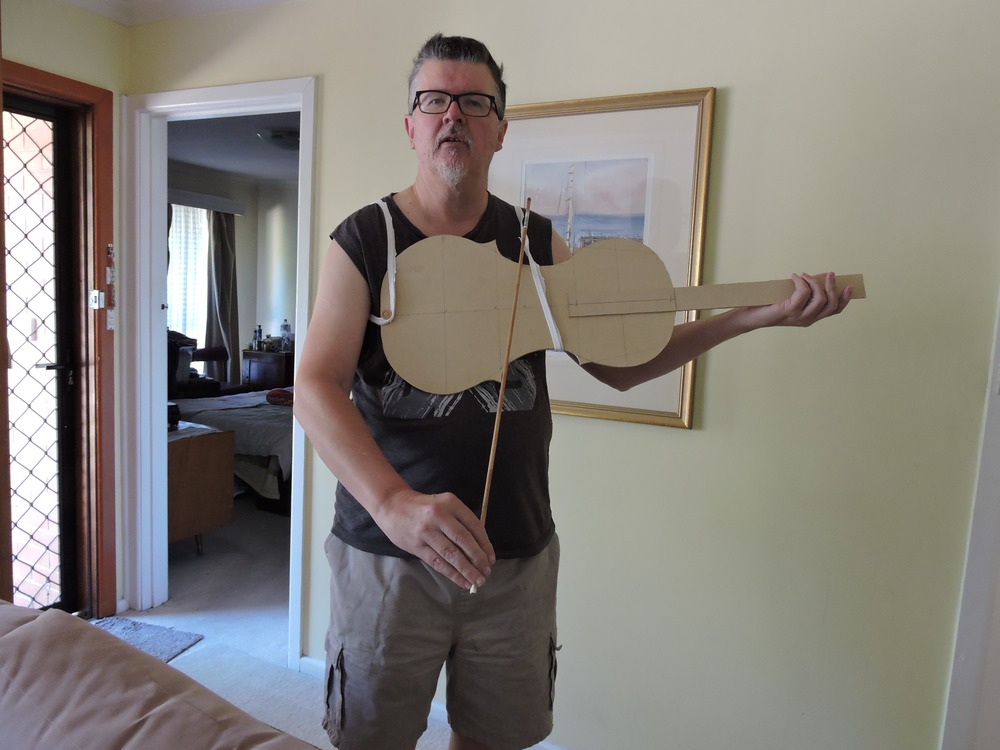Had another win. Even without a support strap it is playable sitting down supported on the right thigh – well, playable on three strings anyway.