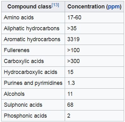 The follow up question is whether all of these are also found in meteorites? I don’t know, but the discovery is nothing compared to the list of organic chemicals found in meteorites, see list below. Thiophene is not one of the chemicals detected in interstellar space. Neither is dimethylsulfide = C2H6S. Methanethiol = CH3SH has been seen in interstellar space.