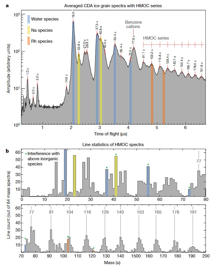 “Identified organic mass lines of individual HMOC spectra.” OK, so they measured mass spectra in both the Enceladus plume and in Saturn’s E ring, not chemical elements individually.