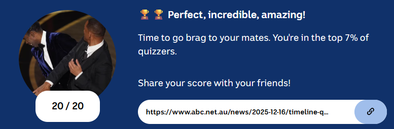 13/20 Most were guesseshttps://www.abc.net.au/news/2025-12-16/timeline-quiz-dec-11/106120778