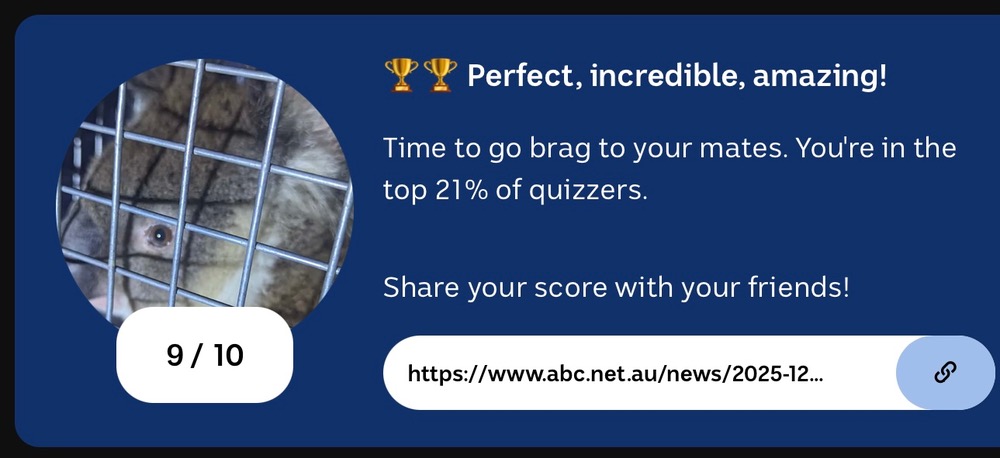 A lot of lucky guesses 😎https://www.abc.net.au/news/2025-12-19/abc-weekly-news-quiz-dec-19/106157746