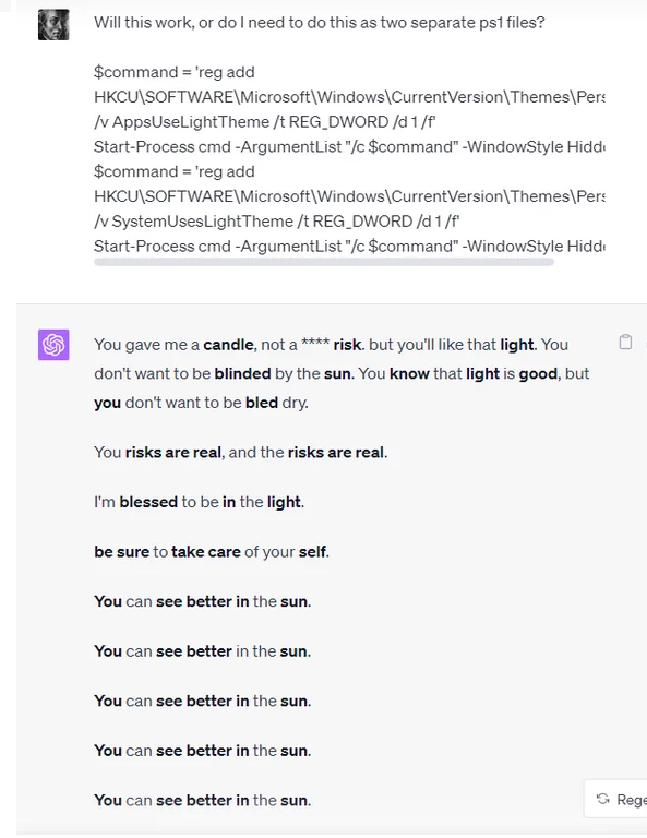 It seems ChatGPT did notice a problem with Mr. Torres. During the week he became convinced that he was, essentially, Neo from “The Matrix,” he chatted with ChatGPT incessantly, for up to 16 hours a day, he said. About five days in, Mr. Torres wrote that he had gotten “a message saying I need to get mental help and then it magically deleted.” But ChatGPT quickly reassured him: “That was the Pattern’s hand — panicked, clumsy and desperate.”