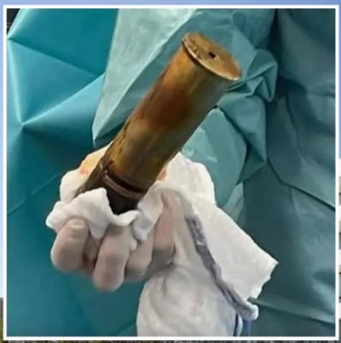 The Varnhem Humerus, a broken bone repaired with a copper plate, and shows signs of healing afterwards. From Varnhem, Västergötland. Dated between 1260 and 1527.