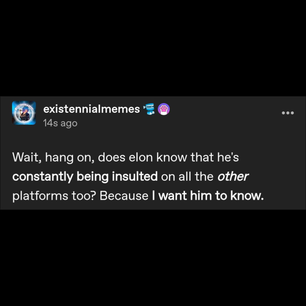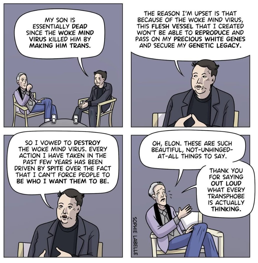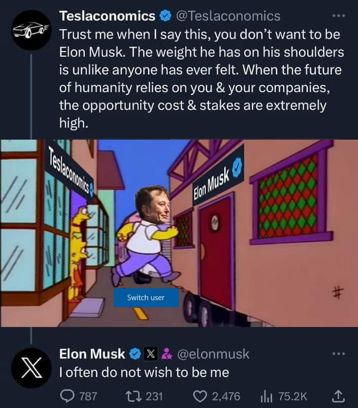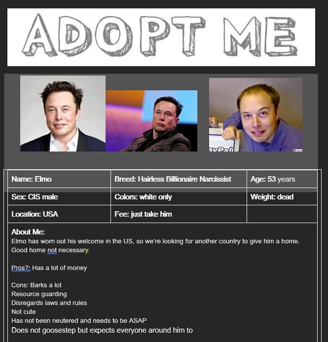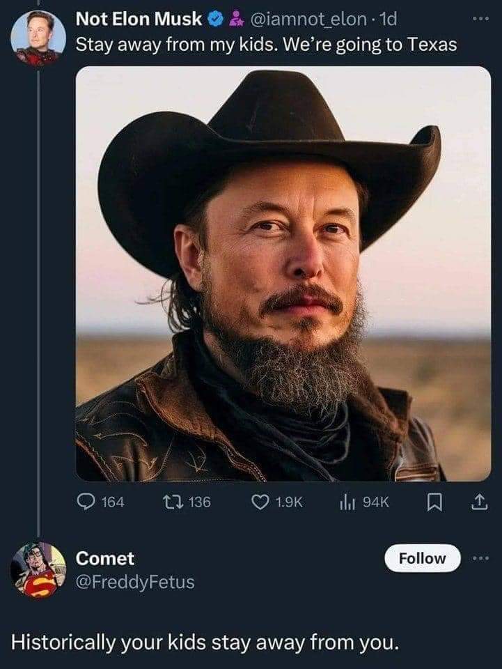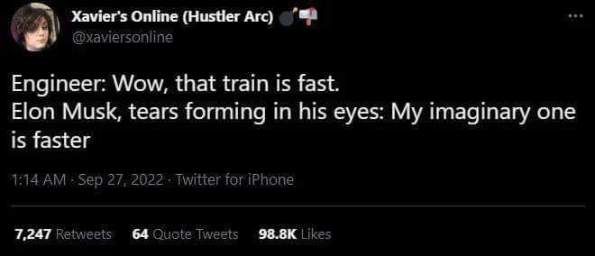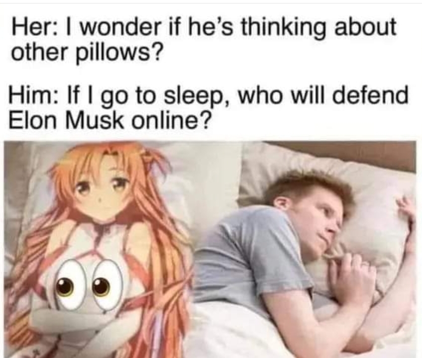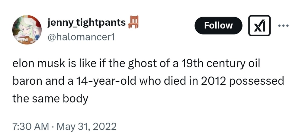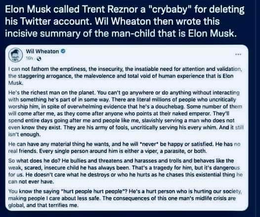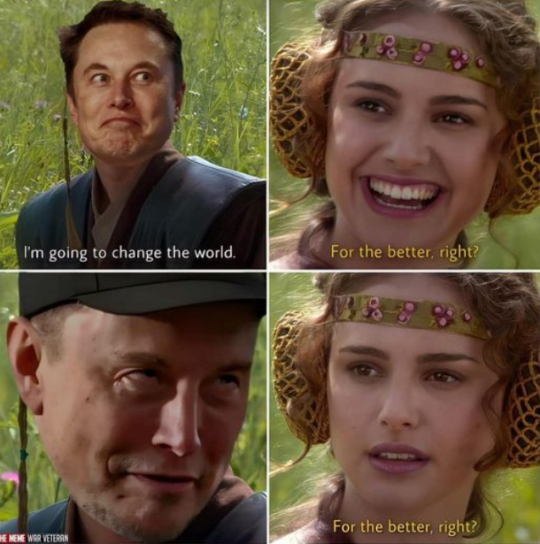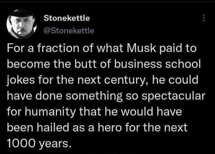 Honestly if he’d just kept on keeping on with Tesla and SpaceX he’d be sweet. It was really only his pro-Covid, anti-union and anti-woke brainbug that led him to want a Social Media platform in the first place and shit just spiralled out of control from there. It’s probably not too late: it must be tough for someone in his situation to know who to listen to, especially when the people you really need to listen to aren’t telling you what you want to hear.