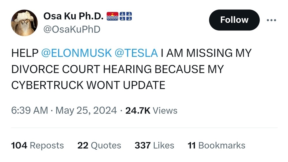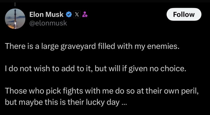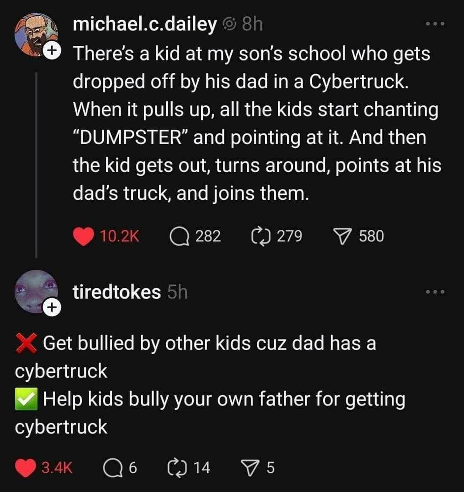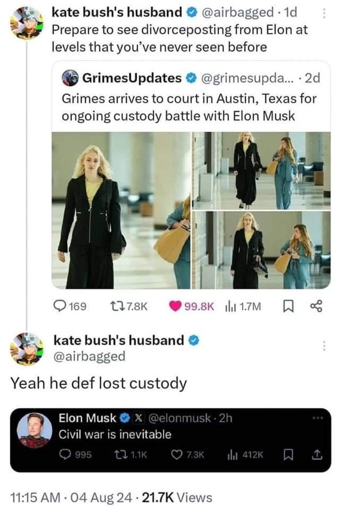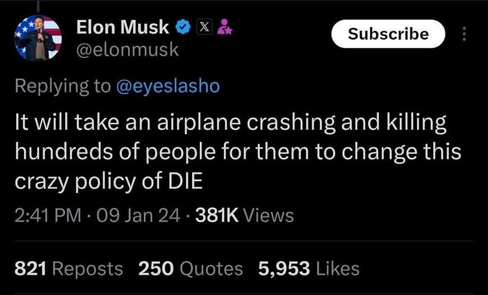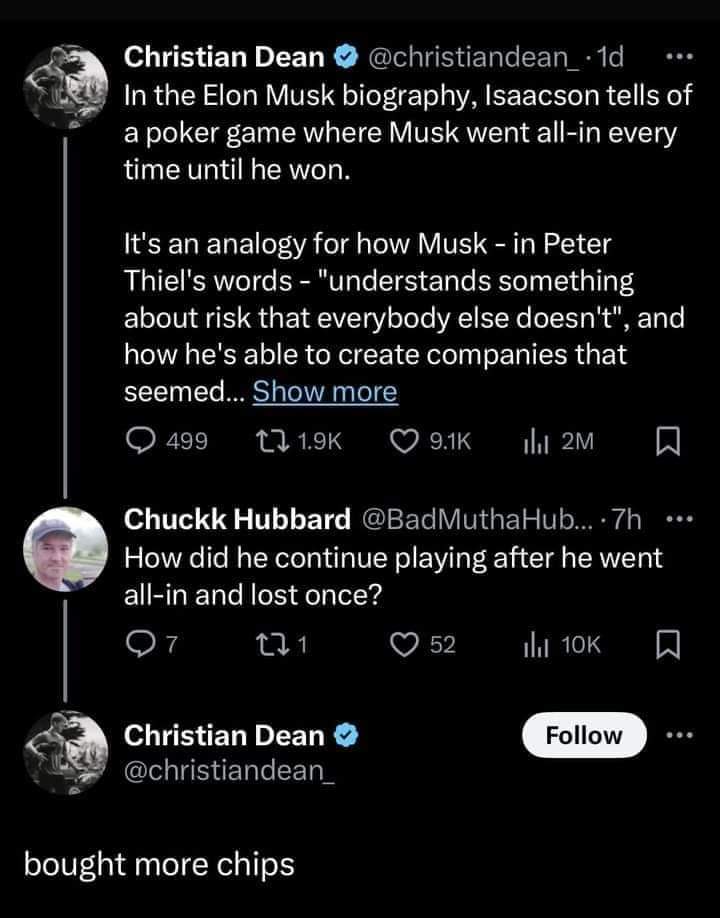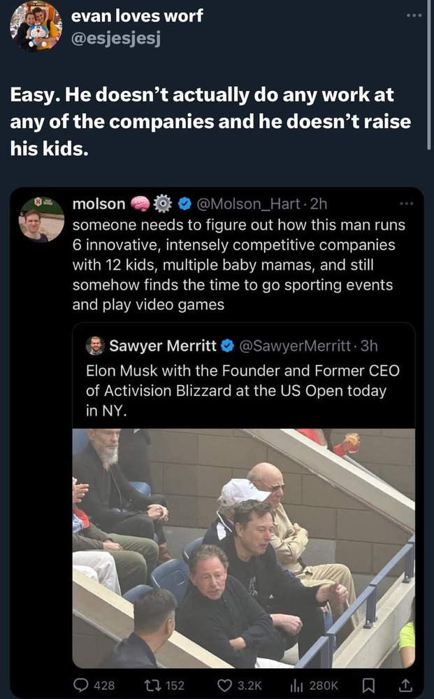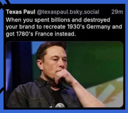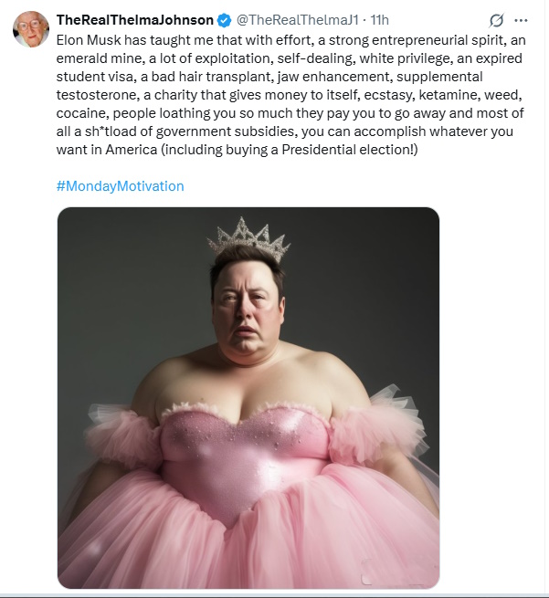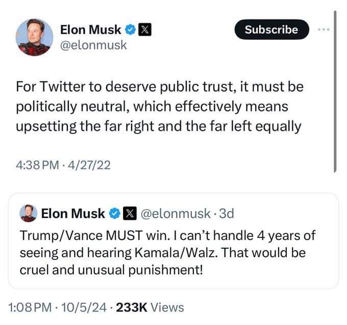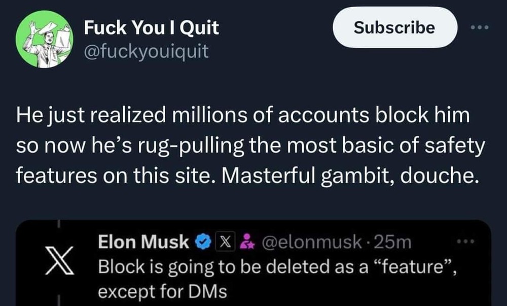 Honestly if he’d just kept on keeping on with Tesla and SpaceX he’d be sweet. It was really only his pro-Covid, anti-union and anti-woke brainbug that led him to want a Social Media platform in the first place and shit just spiralled out of control from there. It’s probably not too late: it must be tough for someone in his situation to know who to listen to, especially when the people you really need to listen to aren’t telling you what you want to hear.