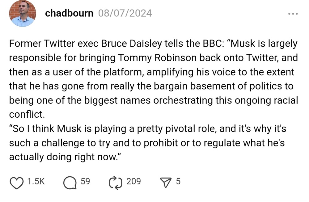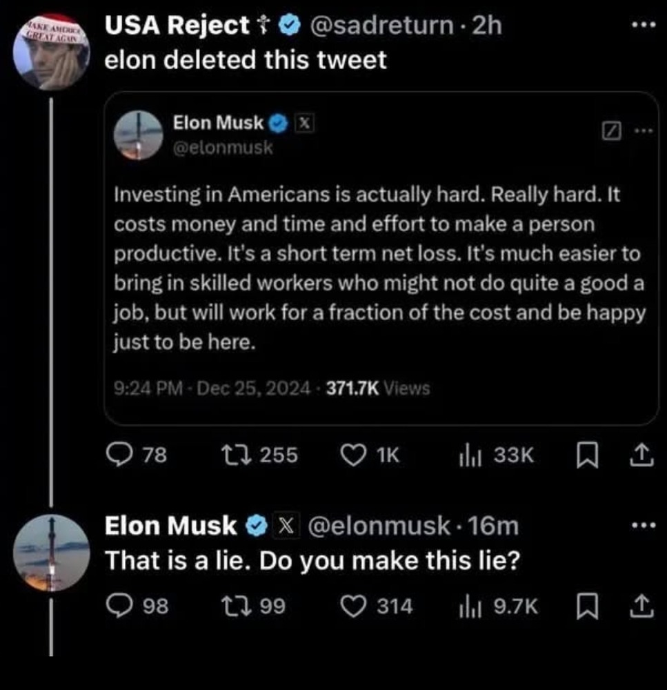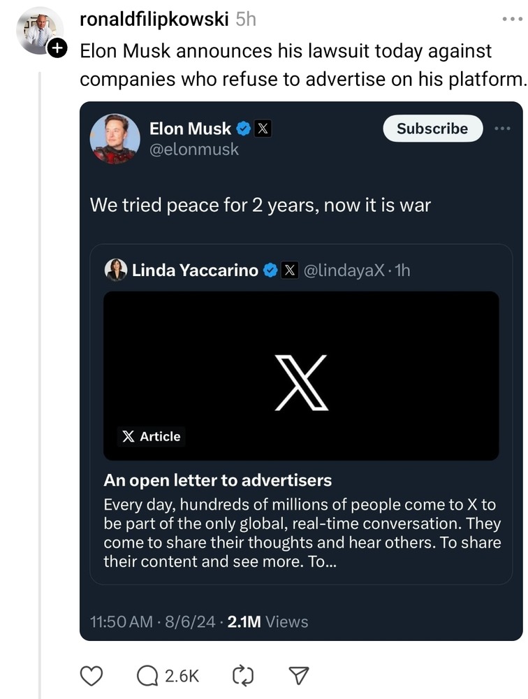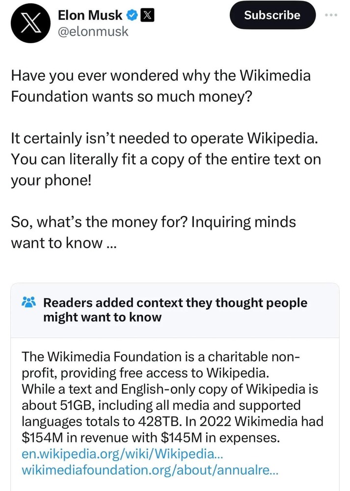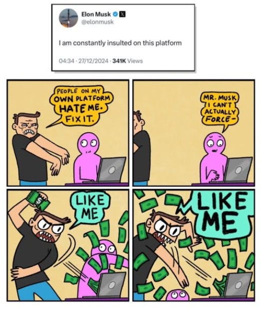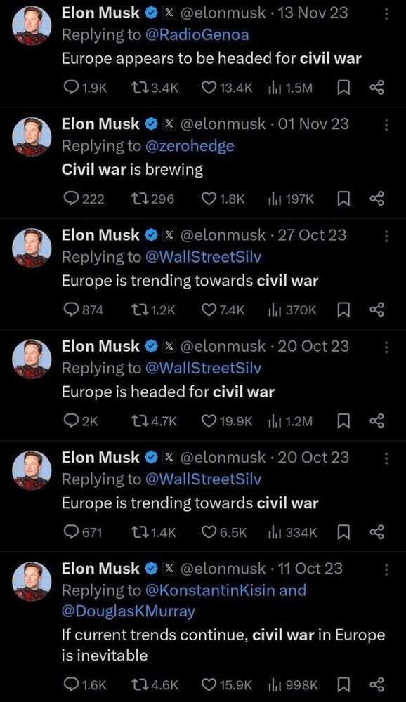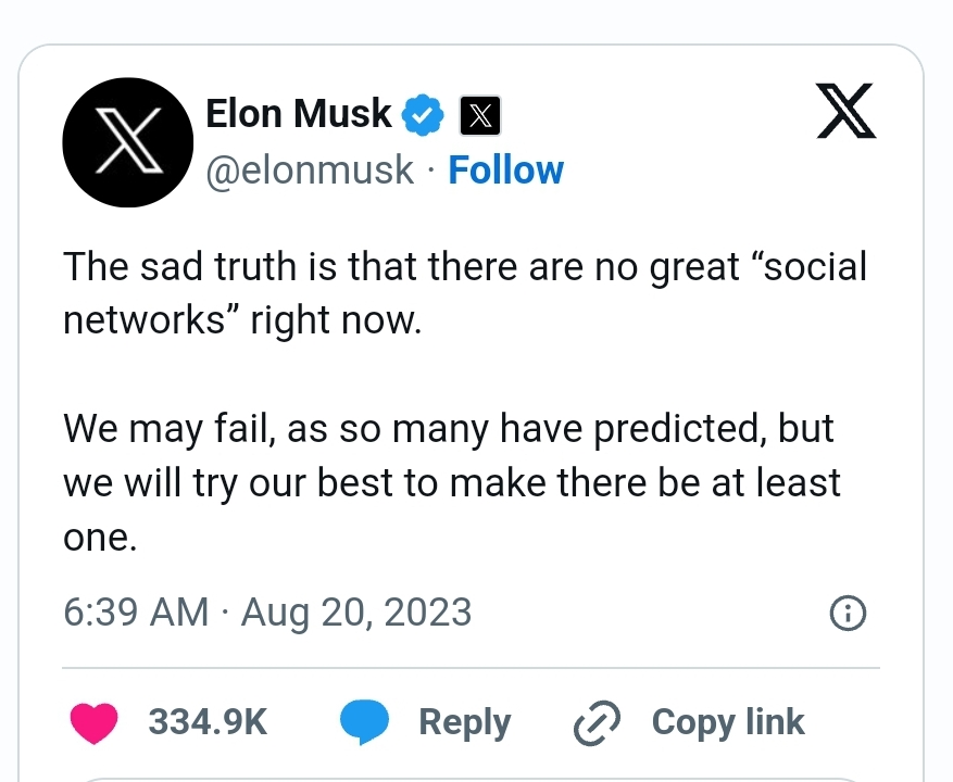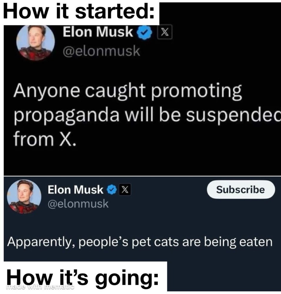 PermeateFree said:For a start he did not really want to purchase Twitter, but took initial actions that made it difficult to back out. He was never keen on the way twitter was run and wanted to radically change it, which he is in the process of doing; whether this turns out in the long-term to be better or worse remains to be seen, but it is far too early to judge.