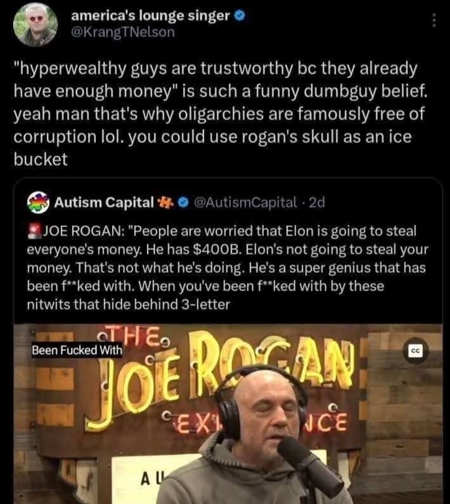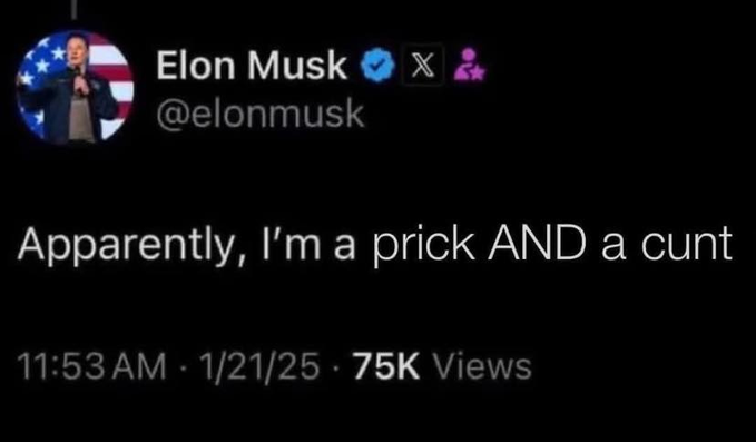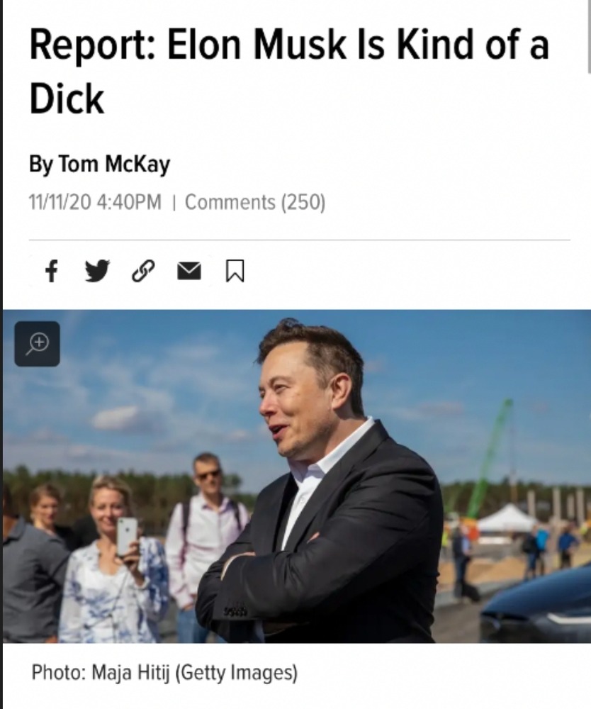 Nah, he’s just a cunt.The value of his companies is waaaaaay over-inflated and over-hyped. As are tech stocks generally. Take Tesla for example, it has a market cap of around 800 billion USD. about 4 times more than Toyota, and 8-10 times Ford, Mazda, GM and the other majors. Tesla are barely in the top 20 list of largest manufacturers by cars produced, and not even the largest EV maker. It is all just wind and hype driven by speculators. Sooner or later Tesla needs to stop being considered as a “tech stock” and considered as a manufacturing business with all the usual constraints of supply chains, labour costs, logistics and all the rest of it.