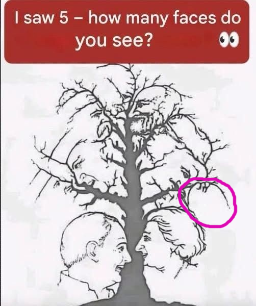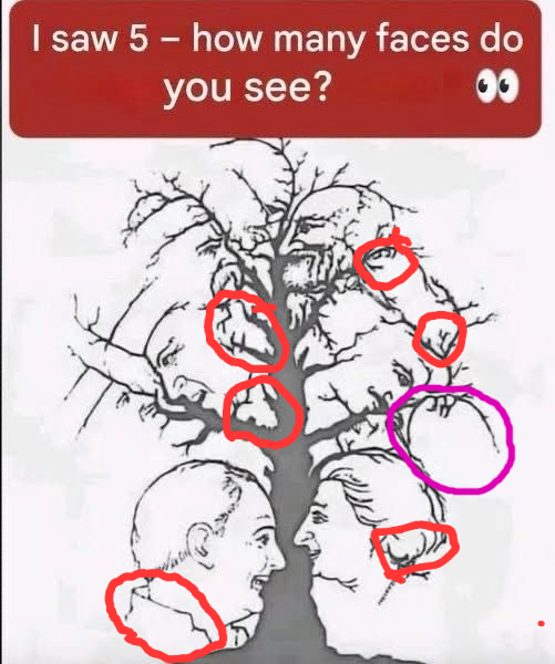 Yeah, the hair of the two immediately above the “Muppet” could be considered two faces, if we are being sufficiently lax about these things :)