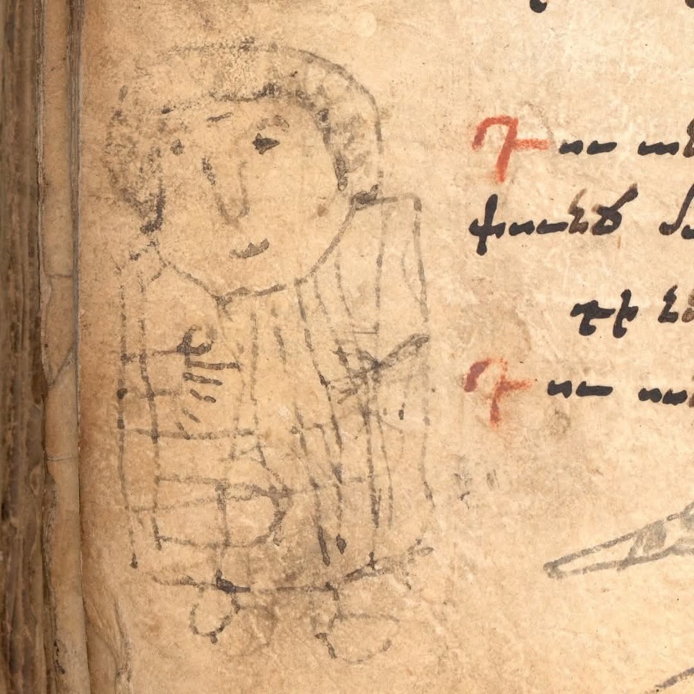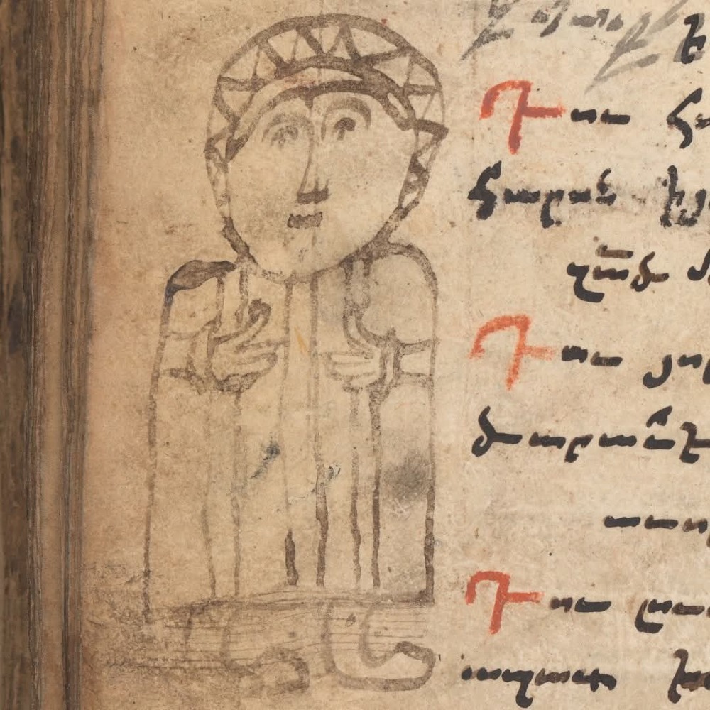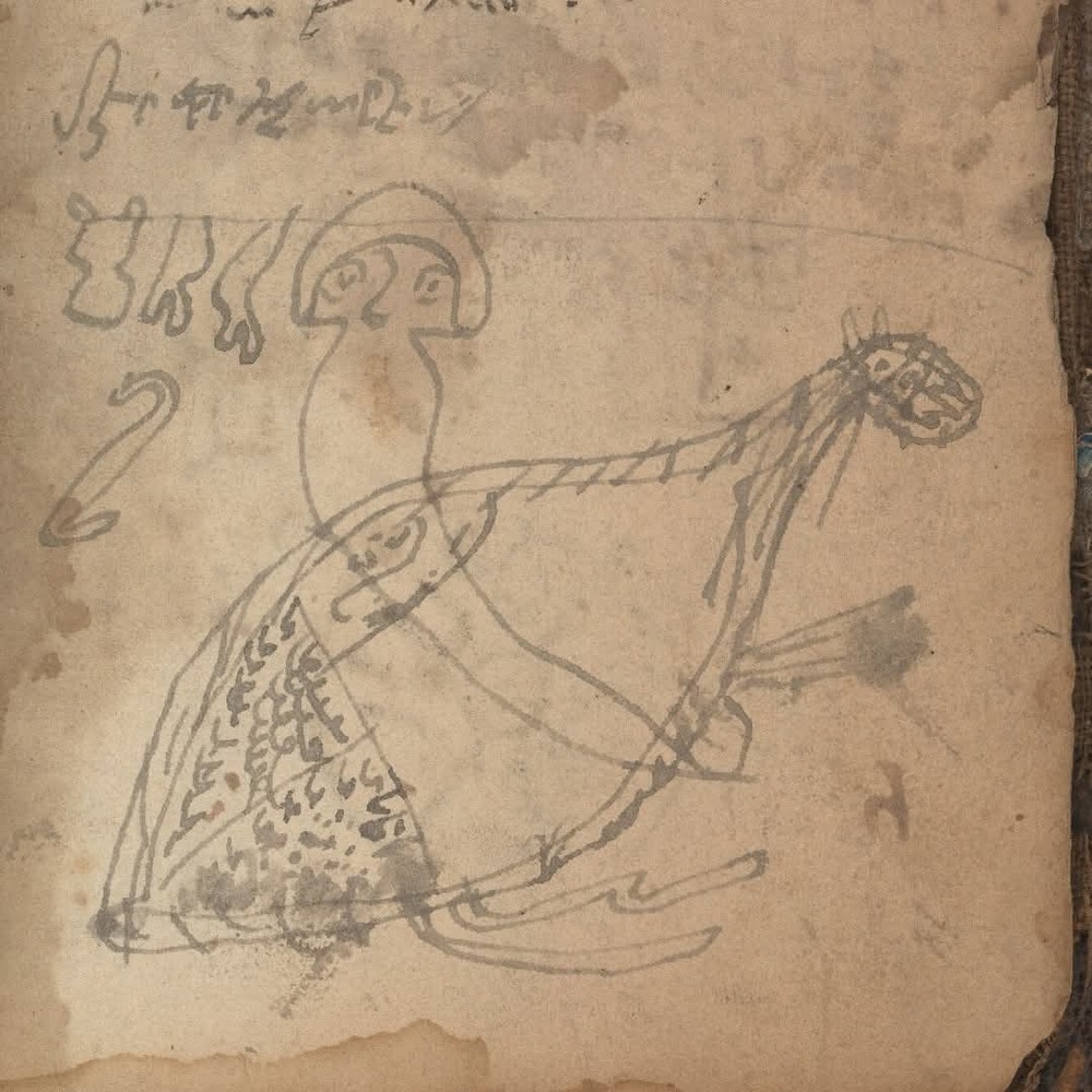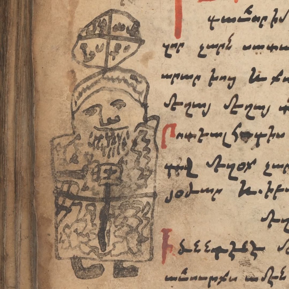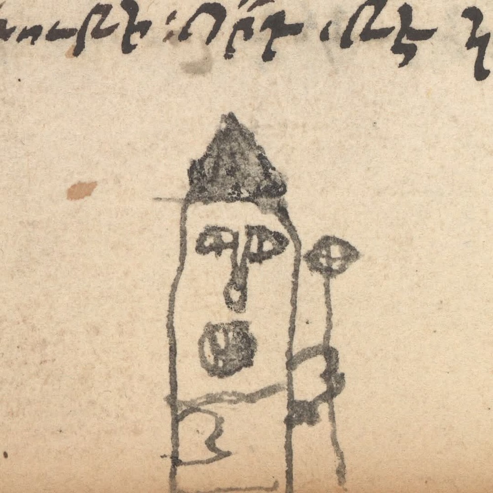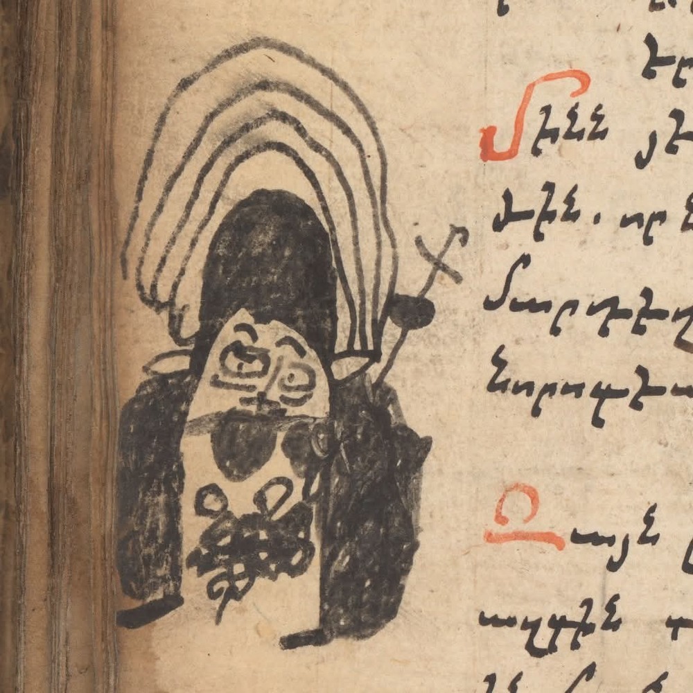 Alt text: These drawings are found in the margins of a 17th century Armenian book of sermons in our collection. They show: a faded saint with a little smile; a bishop with a staff and a muddled-up face; an oddly-shaped person riding a weird horse; a tube-shaped person holding something nondescript with their tiny arms; another attempt at drawing a saint, this time with more success at doing the halo; a tiny person with stick-fingers like little claws; and another saintly figure with good use of scribbling to fill in the boxy torso.