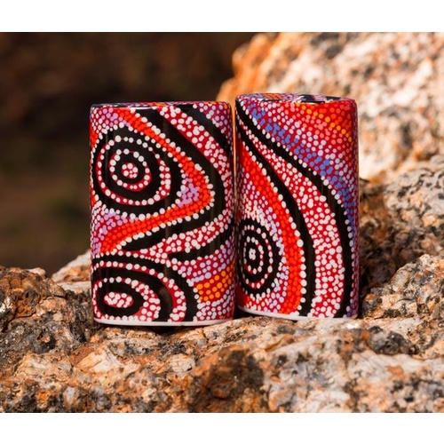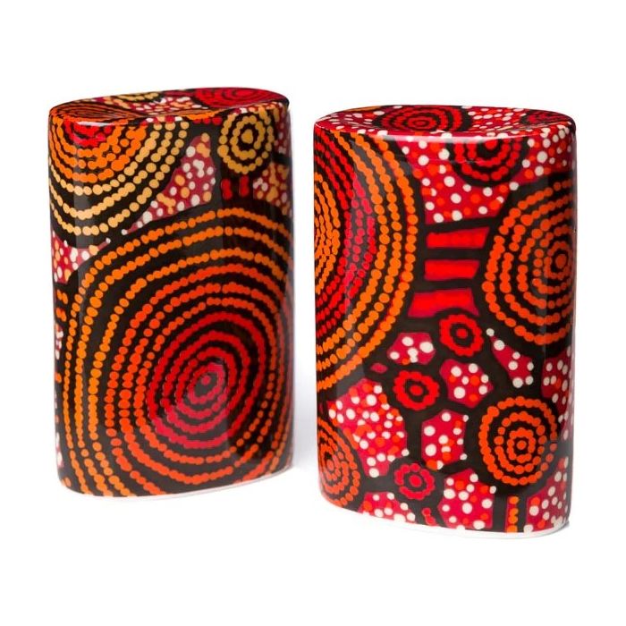 Found these salt and pepper shakershttps://www.kullillaart.com.au/warlukurlangu-aboriginal-art-fine-bone-china-salt