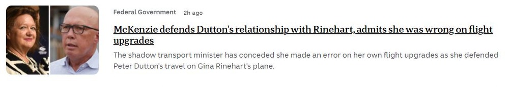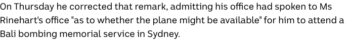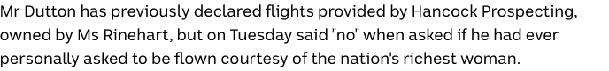 Peter Dutton has corrected remarks that he never requested access to mining magnate Gina Rinehart’s private jet. Opposition Leader Peter Dutton has admitted his own error after saying he had never requested access to billionaire mining magnate Gina Rinehart’s private jet in his travels. Mr Dutton has previously declared flights provided by Hancock Prospecting, owned by Ms Rinehart, but on Tuesday said “no” when asked if he had ever personally asked to be flown courtesy of the nation’s richest woman. On Thursday he corrected that remark, admitting his office had spoken to Ms Rinehart’s office “as to whether the plane might be available” for him to attend a Bali bombing memorial service in Sydney.