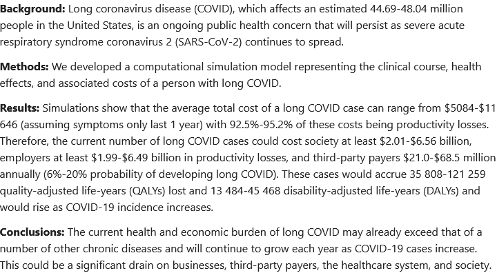Conclusions: The current health and economic burden of long COVID may already exceed that of a number of other chronic diseases and will continue to grow each year as COVID-19 cases increase. This could be a significant drain on businesses, third-party payers, the healthcare system, and society.