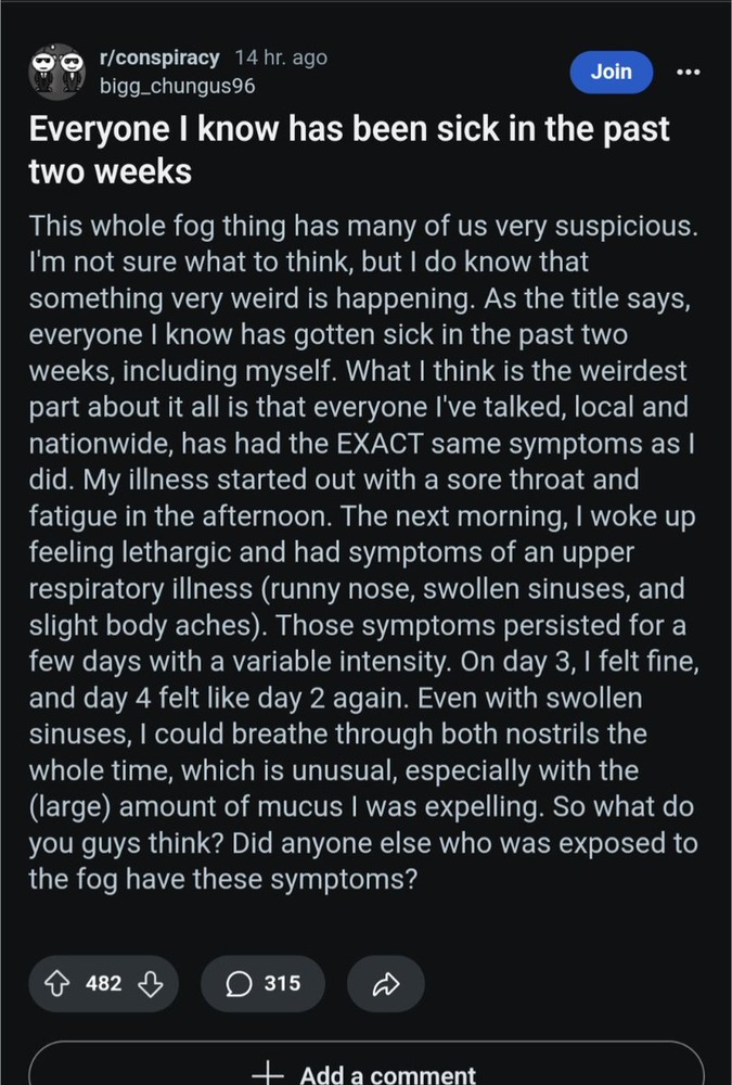 Well all right we wouldn’t know if this is it but we’dn’t be surprised if the antiinfectionists realised they could play the same game and use disinformation conspiracy theorist plays to change behaviour, as in tell a white lung lie to get the children to behave, call it an invisible odourless fog that the governments are allowing to poison everyone and the only way to protect yourself from the mind control is to wear a damn good mask
