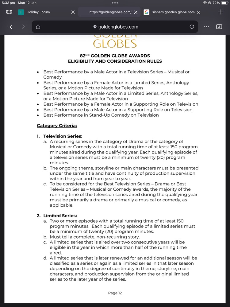 Looks like Sinners got 7 nominations. It looks to be a tough year, the Oscar noms will be interesting.With the Emmys, they have this weird rule that a TV series shorter than an hour has to go into the Comedy/Musical category even if it’s a drama. That dumb rule is the reason The Bear consistently wins the Comedy/Musical category and not drama.