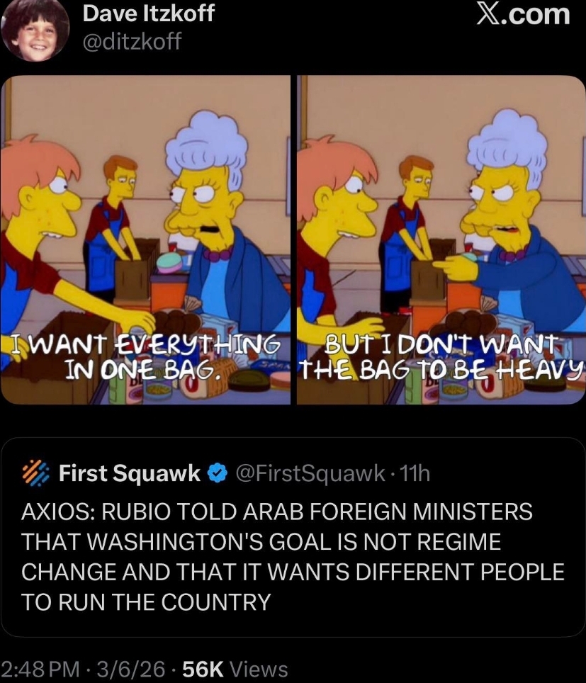 The view from abroad is clarifying in other ways, too. China has continued calling for an end to hostilities and for meaningful peace talks, saying prolonged conflict serves no one’s interests and that the pressing priority is to create conditions for sincere negotiations. Beijing’s motives are self-interested, open sea lanes and regional stability are not exactly fringe concerns for them, but the contrast remains embarrassing for Washington.