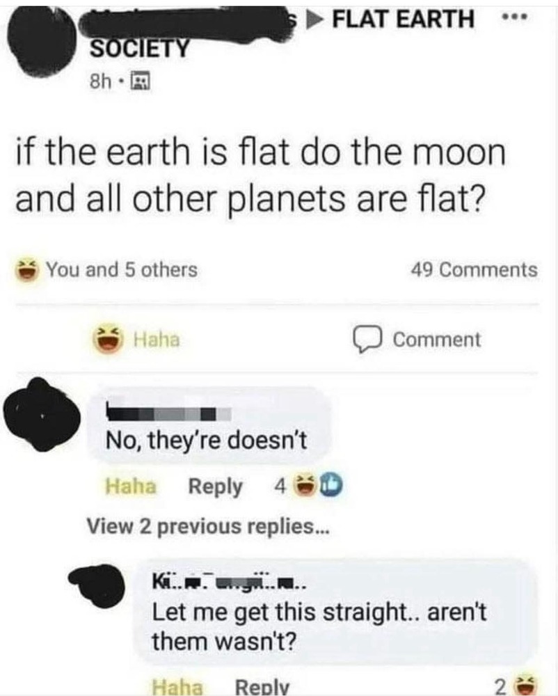 Flat Earthers are the worst. They utterly refuse logic & evidence, etc.Bubblecar said:
