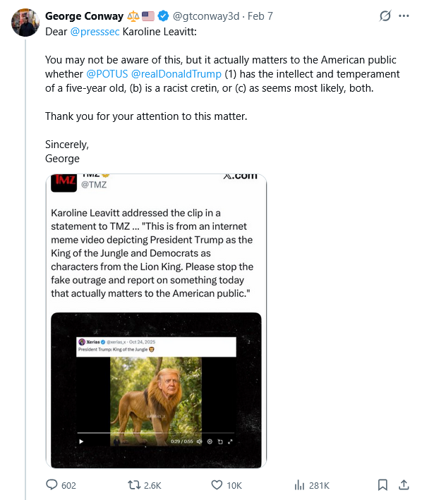 “This is from an internet meme video depicting President Trump as the King of the Jungle and Democrats as characters from the Lion King. Please stop the fake outrage and report on something today that actually matters to the American public,” said Leavitt to POLITICO.