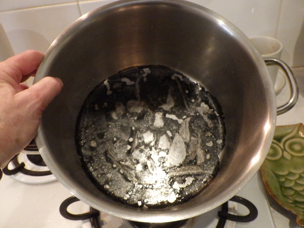 OK, so when I was unloading the chest freezer for defrosting yesterday, I put a couple of kg of frozen apple slices into a big pot with some water, turned on the gas to boil them…and forgot until I smelt the burning. So now one of my good stainless steel pots is burnt. I’ve scraped the mess into the compost and I’ve attended to the outside with Jex and Ajax. Although Gumption paste worked a lot better than Ajax. Now I need to clean the inside, which is more badly burnt on. The internets suggest boiling vinegar and water, which I am now doing, to loosen the black stuff. Anyone here got any other ideas? I was thinking I might cut up some rhubarb leaves and boil them up (separate boiling from the vinegar one) and see if that helps. Every time I cook rhubarb my saucepan comes out lovely and shiny. I presume that is the oxalic acid.