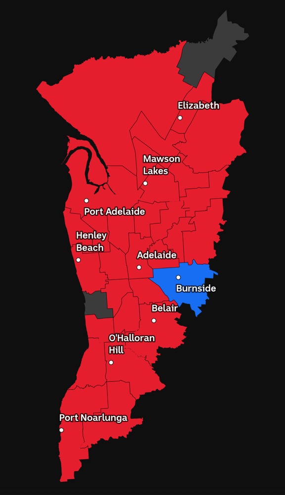 ALP and Greens combine to a majority. This is an improvement, for them, as previously the ALP needed 1 more vote, meaning they had to negotiate with the sometimes pernickity SA-Best, Xenophon’s old crew. SA-Best has been eliminated.