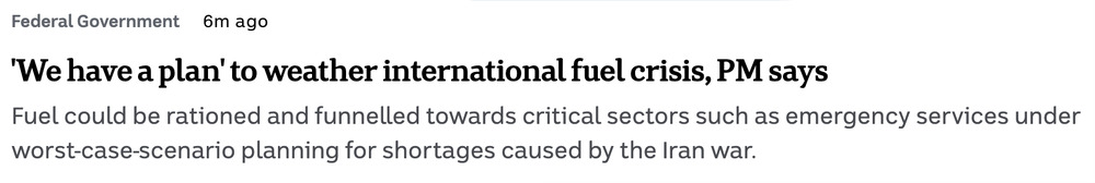 Over the weekend, that pivot was crystal clear when Australia started racing to get fuel here first — at record high rates — underwritten by the Commonwealth. It may seem like a crazy idea, spending so much on boosting our supply, but a long period of complacency across different governments has left us desperately vulnerable.