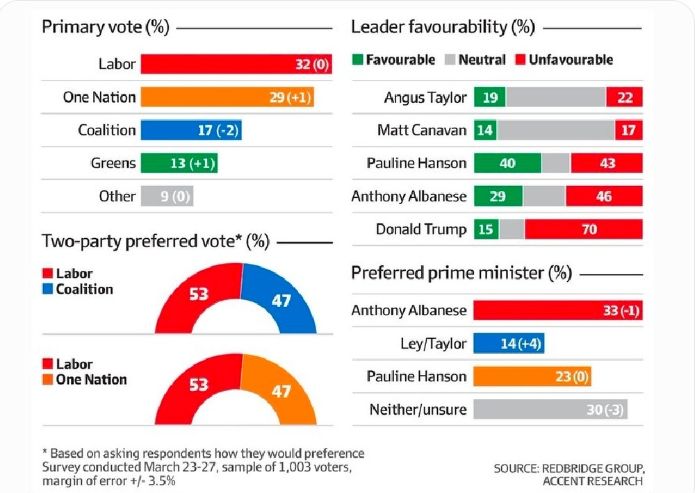 The Financial Review has published polling showing Labor holding two-party leads of 54-46 lead over One Nation and 53-47 over the Coalition.In their three-cornered pitney of a Preferred Prime Minister poll: