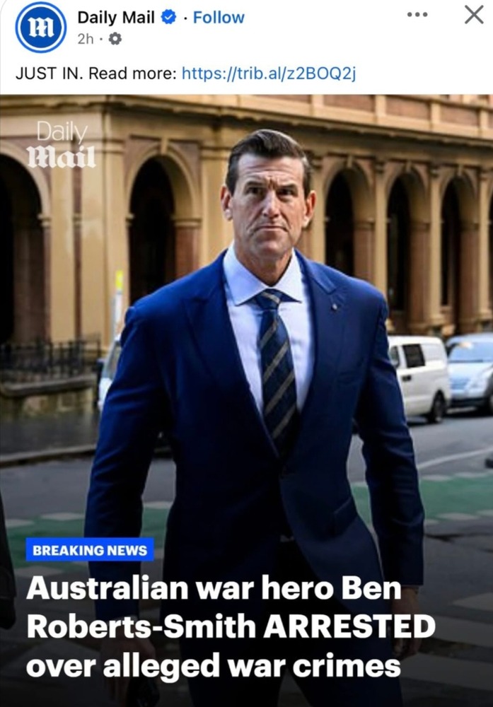 The arrest comes after Mr Roberts-Smith unsuccessfully sued Nine Newspapers over a series of stories about war crime allegations relating to his deployment in Afghanistan.