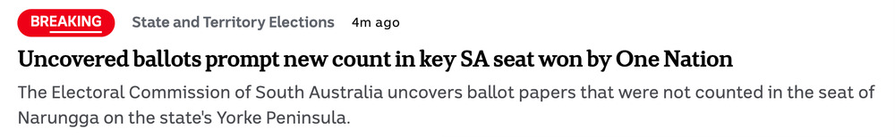 Nepean by-election (2 May): haven’t seen any polling. ALP is not running a candidate so this may end as another three-cornered pitney between ONP, Libs and an independent.
