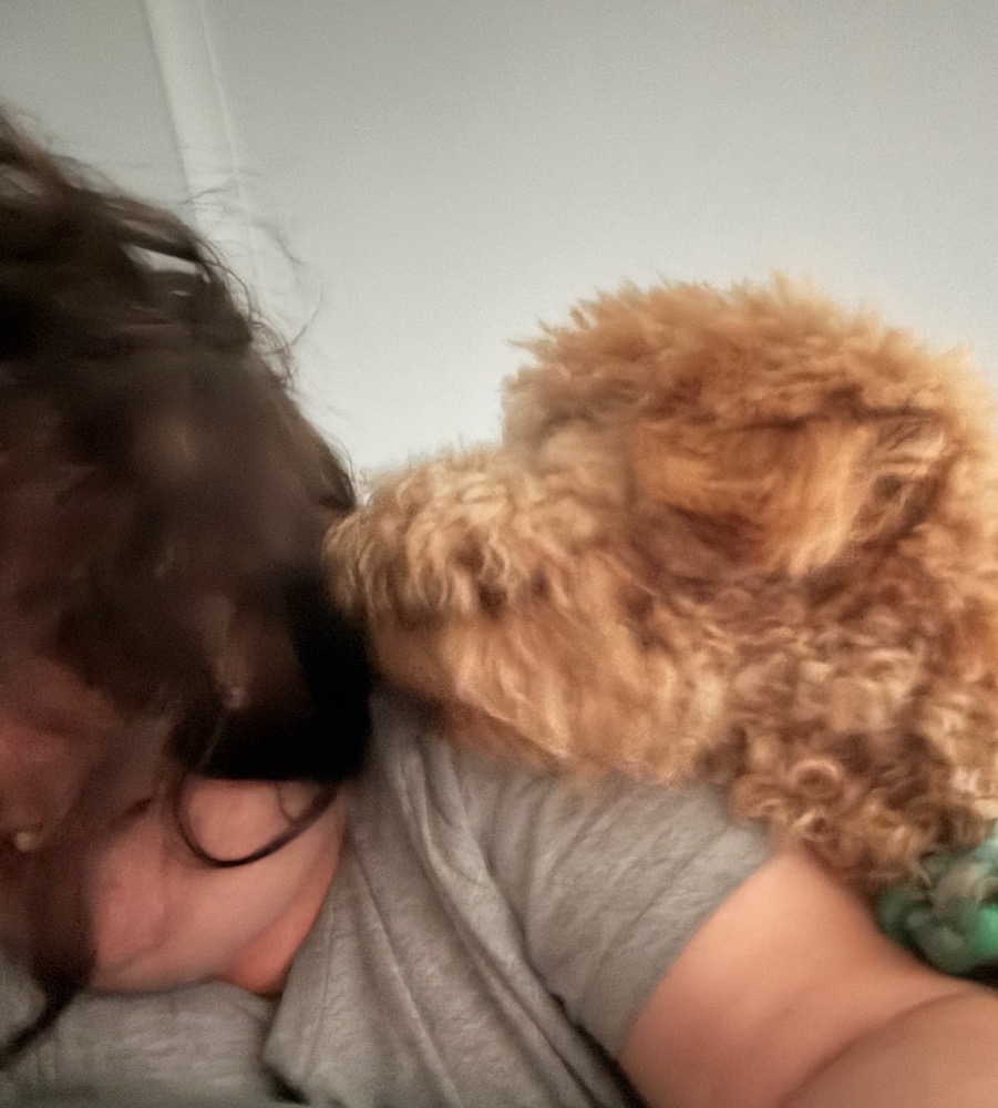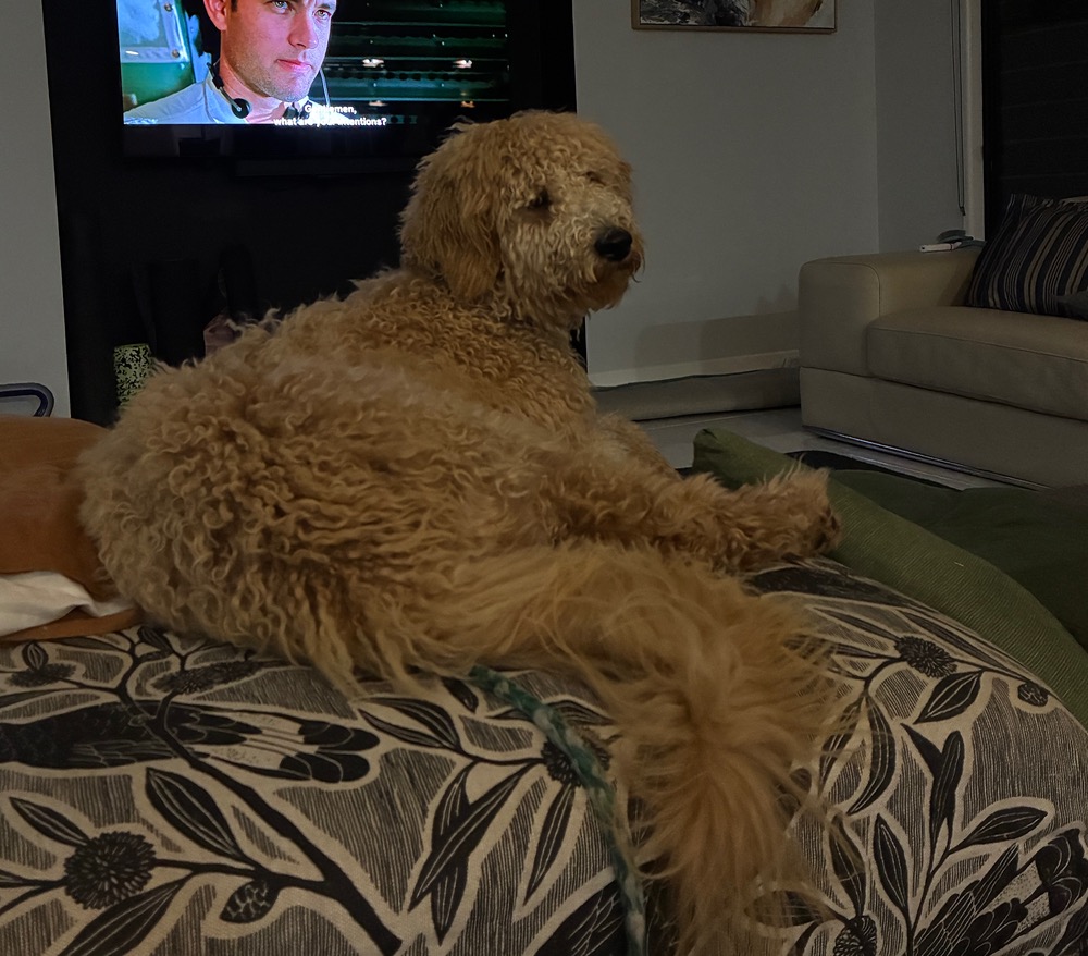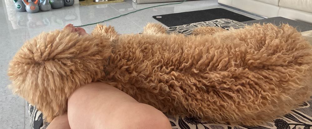 Zeus attended my showering. The shower is open, no door. He wandered to the edge and drank water, sniffed the non-slip bath mat, chewed the corner of the floor mat, and is now doing zoomies around the house.